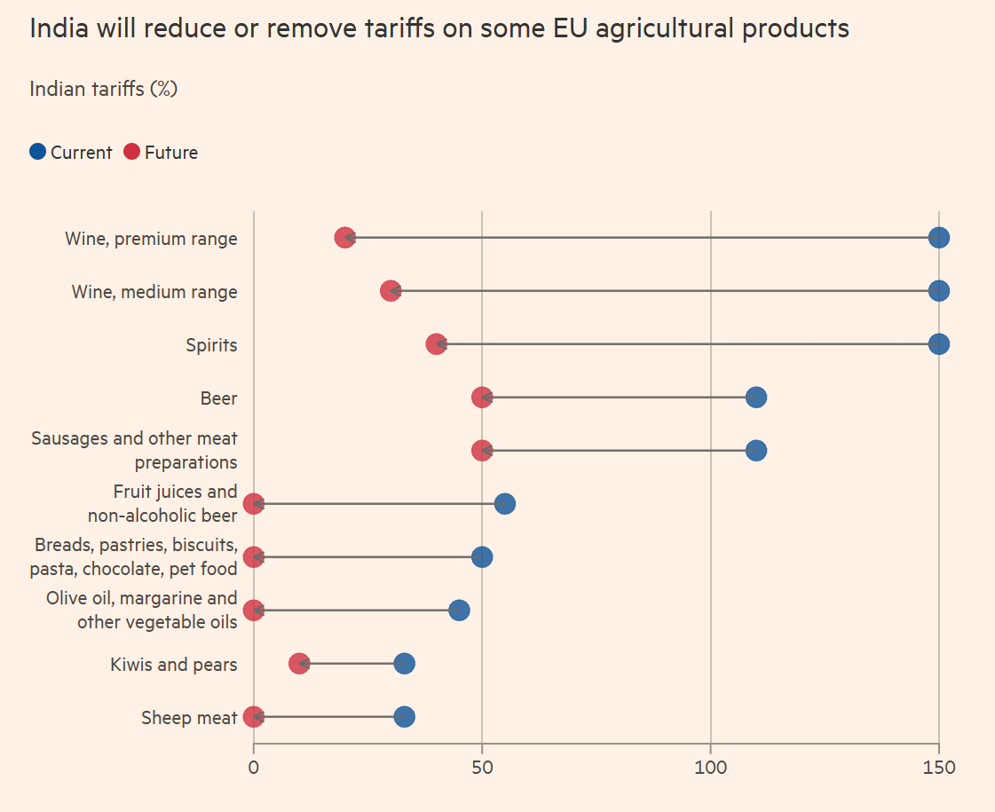 The EU and India have agreed a sweeping trade pact that removes or sharply reduces tariffs on most goods traded between them. Once approved, the deal will eliminate tariffs on around 96% of EU exports to India and give more than 99% of Indian exports preferential access to the EU market.