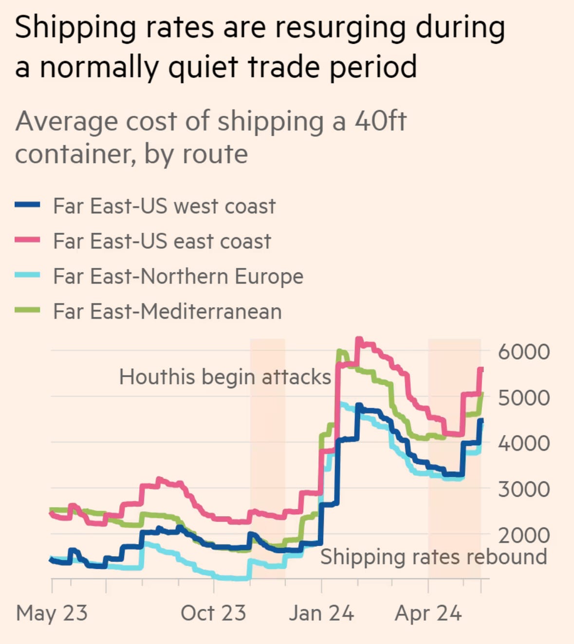 Picture this: shipping a 40ft container from the Far East to northern Europe now costs $4,343. That’s three times what it was last year! Normally, this is the off-season for shipping, but things are different now. Thanks to recent trouble in the Red Sea, ships are having to take the scenic route around Africa, making everything more expensive and slower.