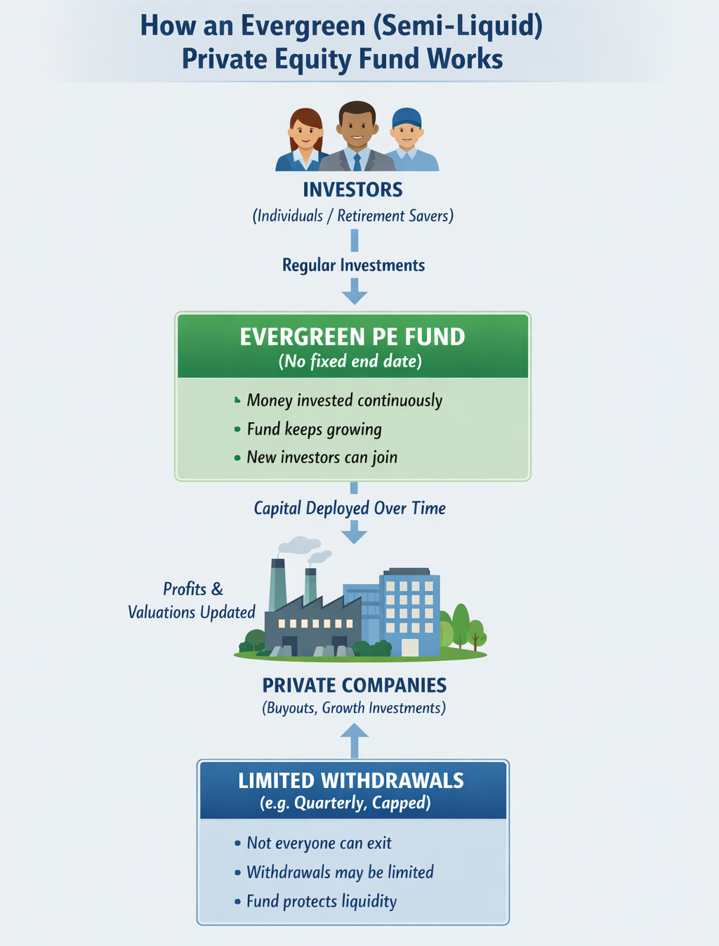These are fancy terms for funds that allow investors to add money over time and, in some cases, withdraw it periodically, rather than locking it away for a decade. This makes private equity feel more accessible, even though the underlying investments remain complex and long-term.